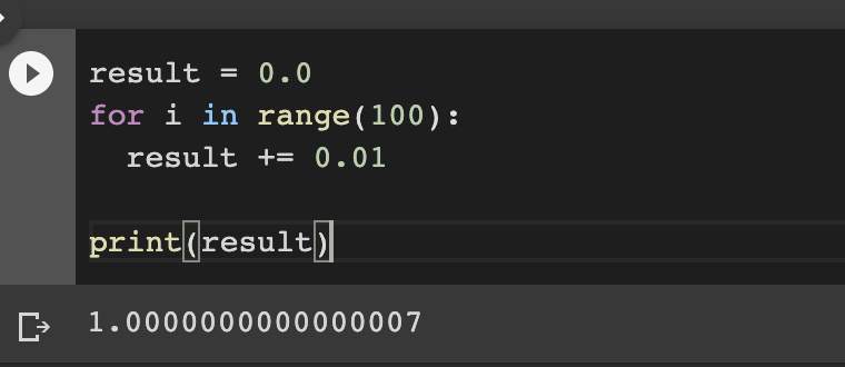 이렇게 실수를 2진수로 표현할 때 표현하지 못하는 소수가 발생합니다.