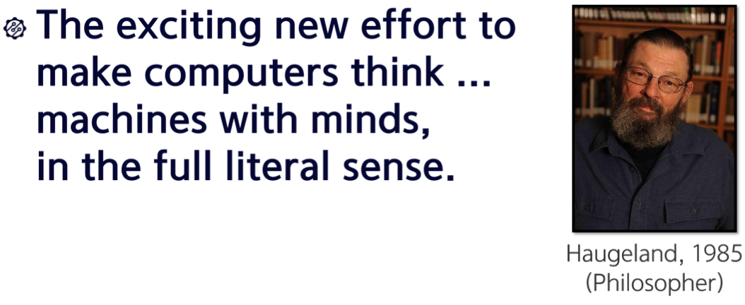 위에 보이는 정의를 보시면, 핵심 단어라고 할 수 있는 게 'computers think 컴퓨터가 생각을 한다.', 'machines with minds. 마음을 가진 기계다.' 이런 식으로 정의가 되어 있습니다.