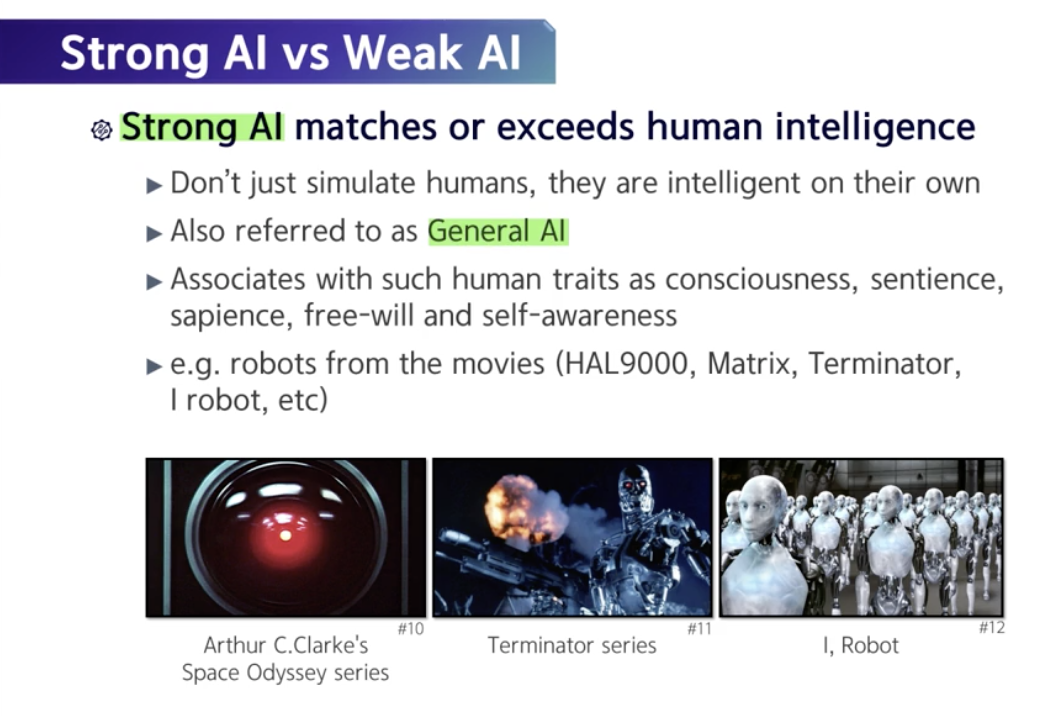 그래서 현실 세계에서는 강 인공지능이 거의 없고, 여러분이 볼 수 있는 건 수많은 영화에서나 가능하다고 할 수 있습니다.