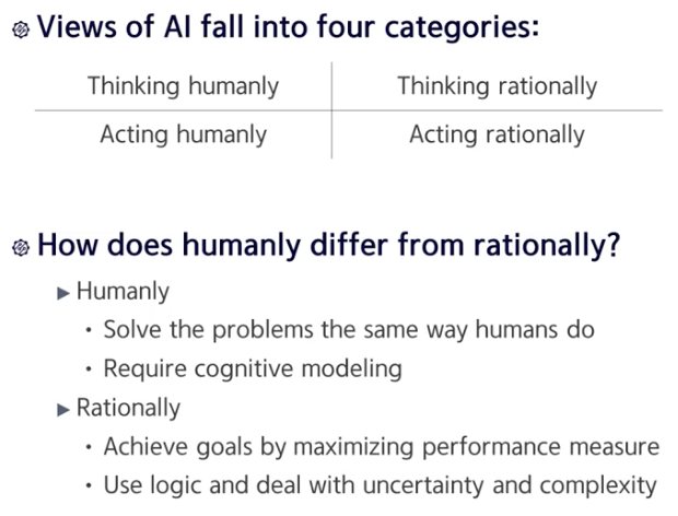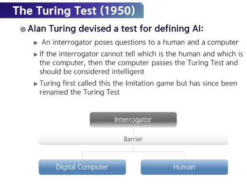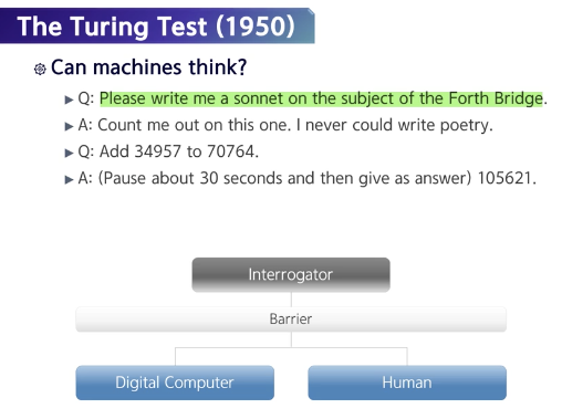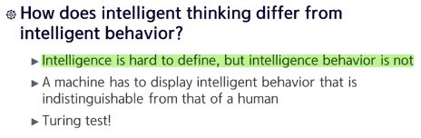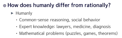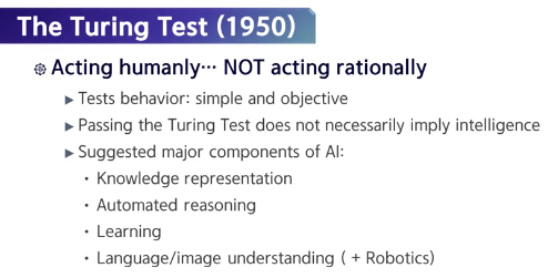 Thinking Humanly 관점에서 구현하는 건 매우 어렵지만, Acting Humanly 관점에서 인공지능을 정의하는 것은 상대적으로 쉽다.