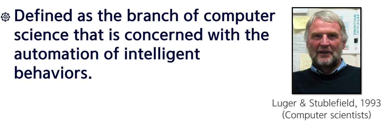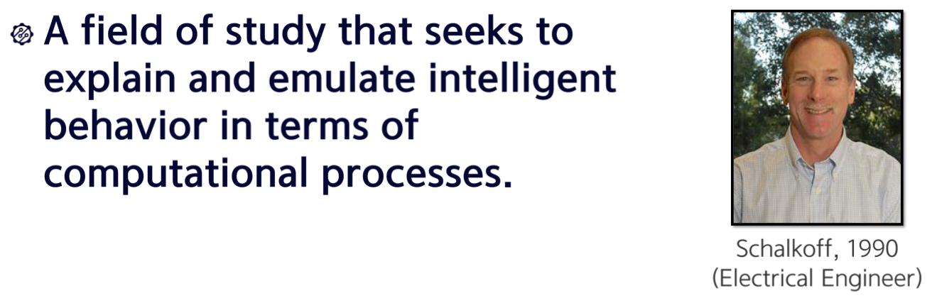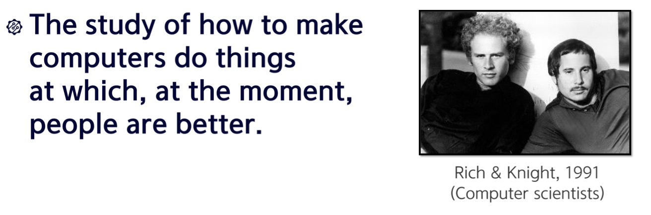 이 정의를 보시면, 결국에 사람이 잘하는 일들을 컴퓨터가 할 수 있도록 하는 학문이라고 정의가 되어 있습니다.