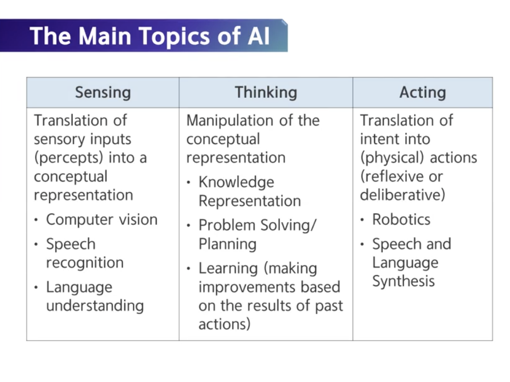 Sensing(Computer Vision, 음성 인식), Thinking(문제 해결, 학습), Acting(Rototics, 음성 발화, 표현)