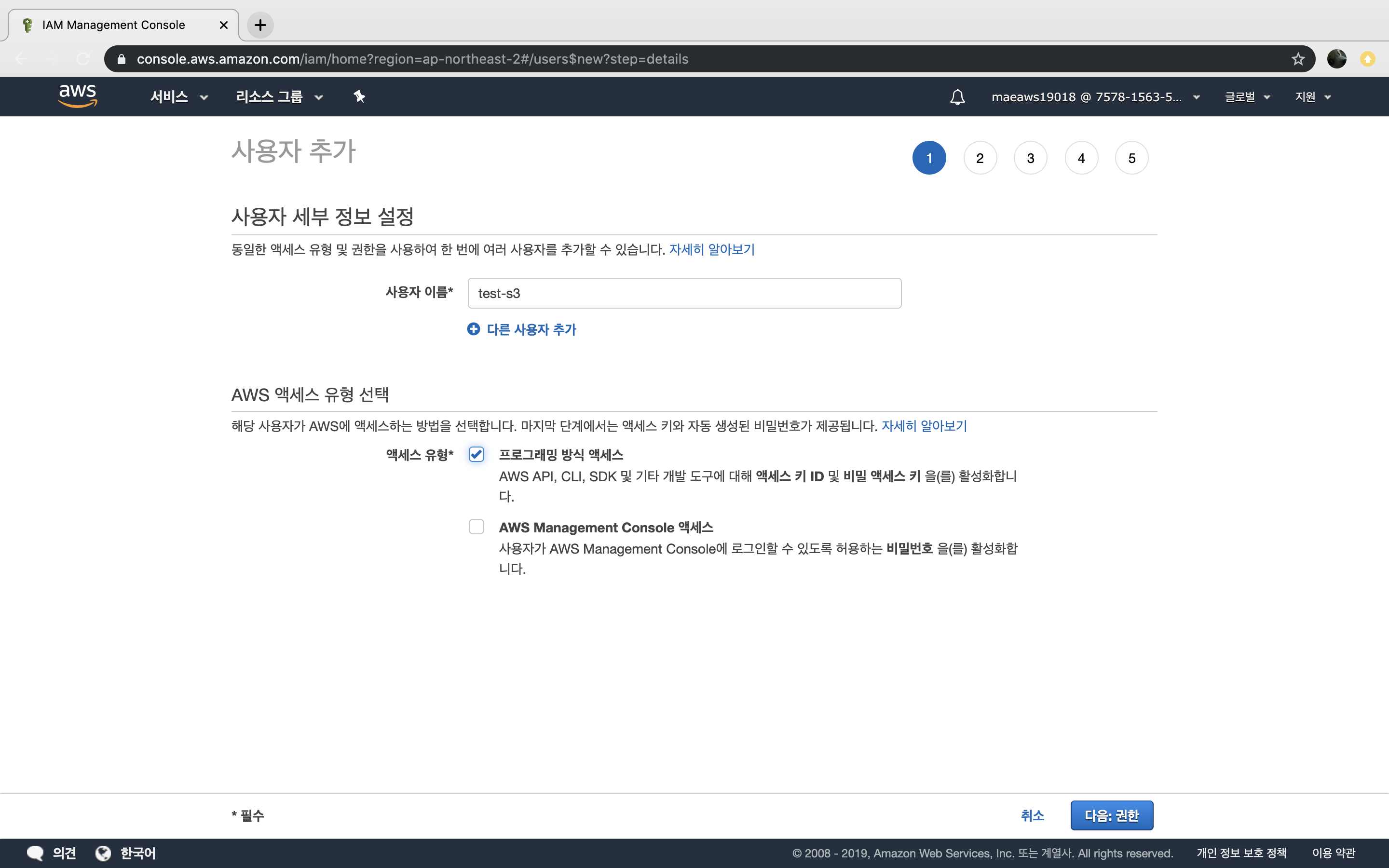 사용자 이름은 자유롭게 설정하고 액세스 유형을 선택합니다