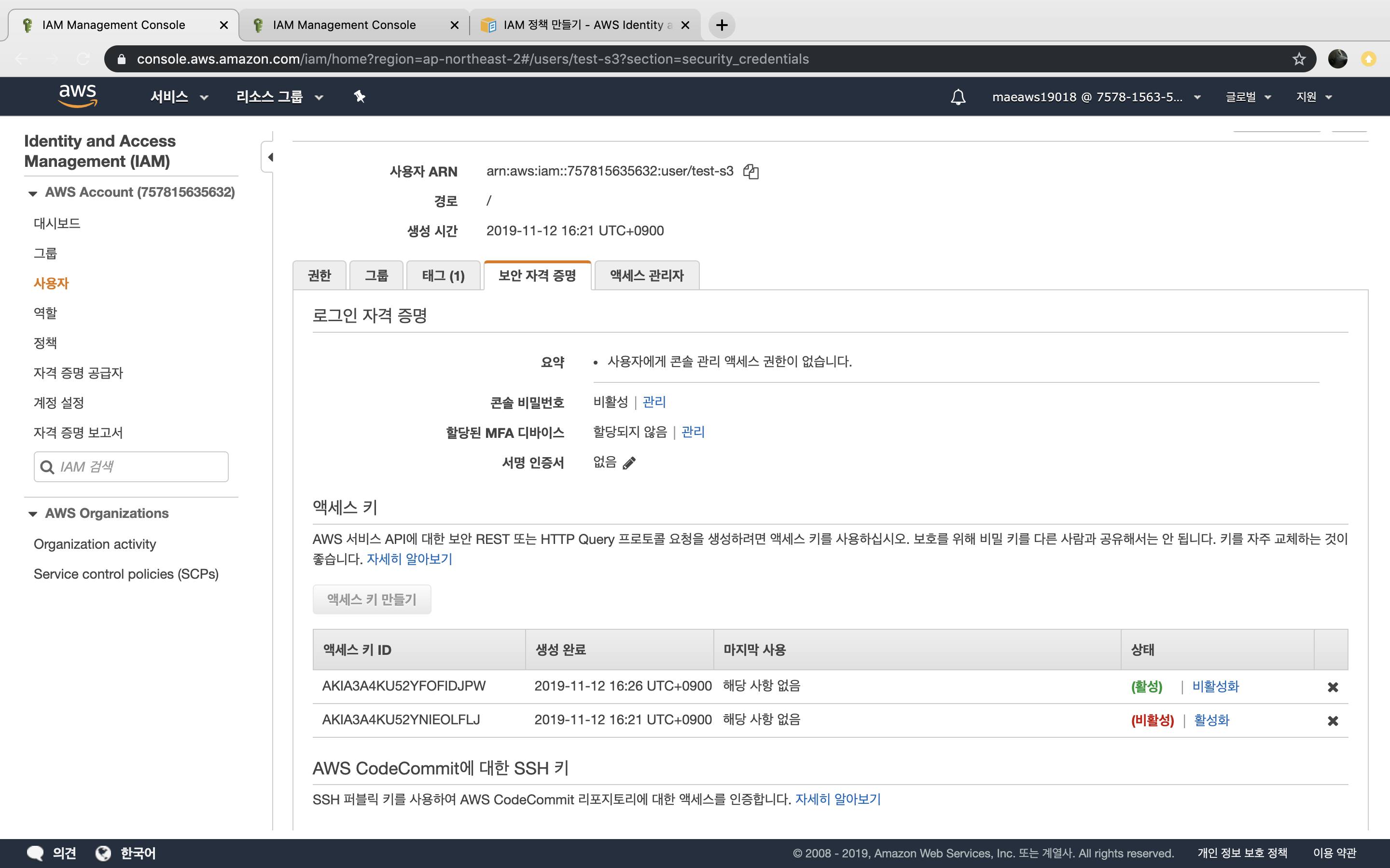 상세 페이지의 보안 자격 증명에서 액세스 키를 새로 만들거나 사용 중인 액세스 키를 비활성화시킬 수 있습니다.