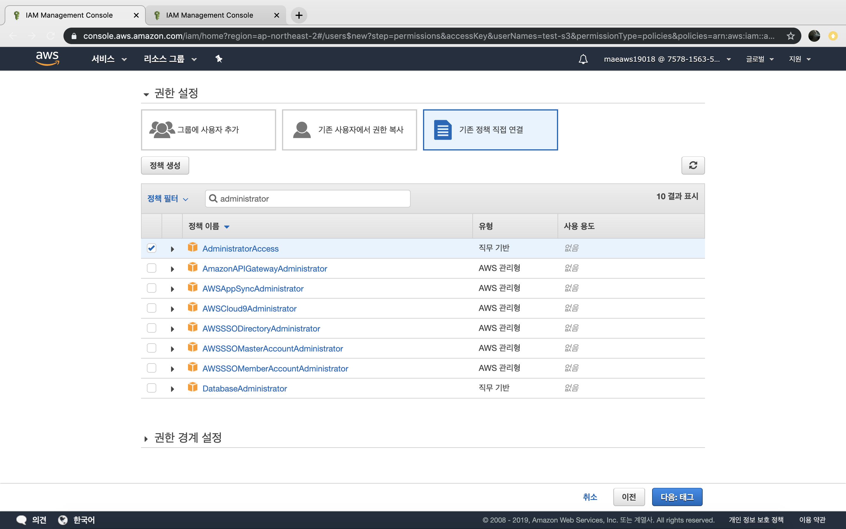 여기서 AdministratorAccess 권한은 실질적으로 루트 계정과 같은 권한이라고 할 수 있습니다.