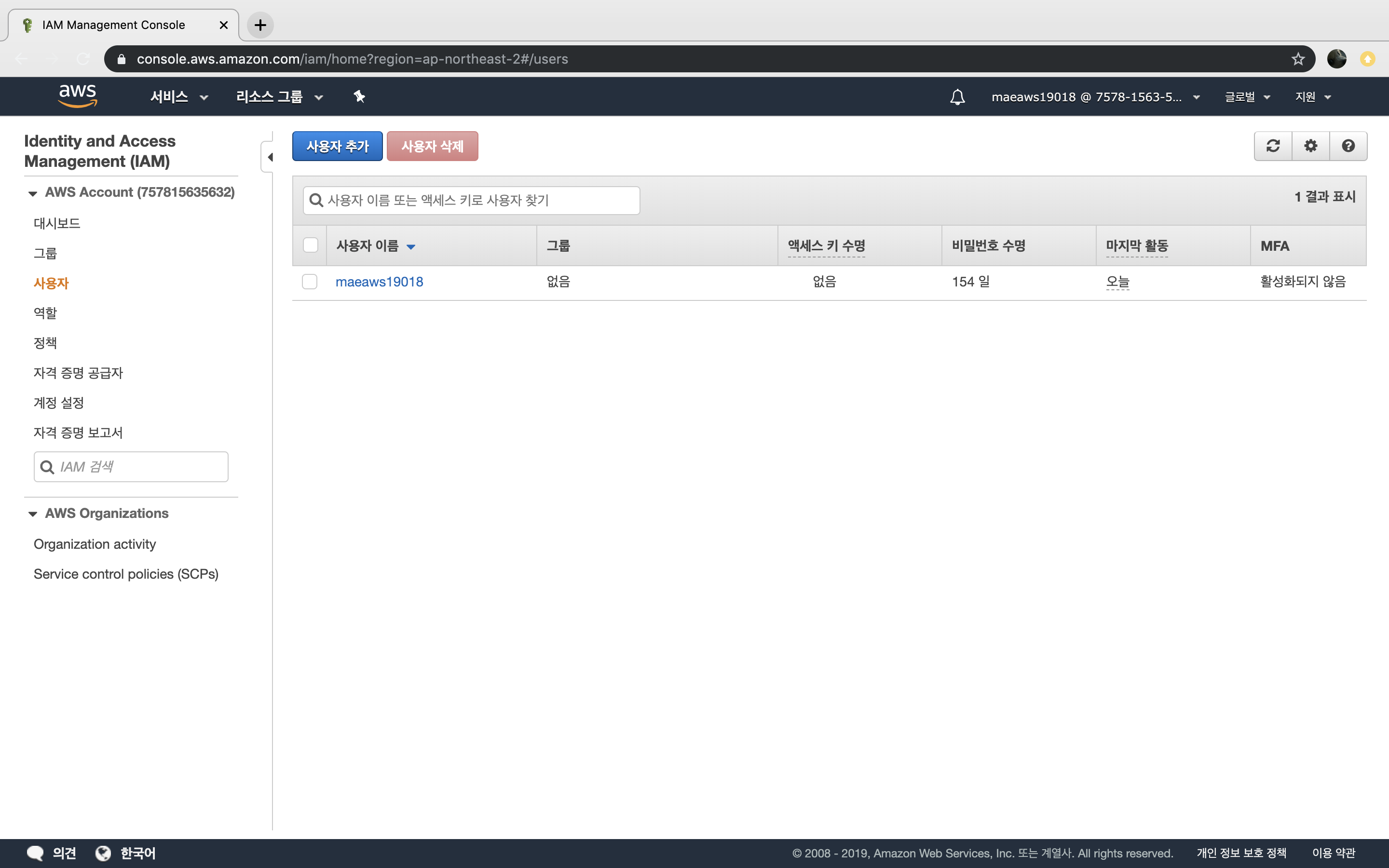 IAM 계정의 비밀번호가 기억나지 않거나 키를 사용할 일이 없어졌을 때 사용자 목록에서 사용자 이름을 클릭하여 상세 페이지로 이동할 수 있습니다.