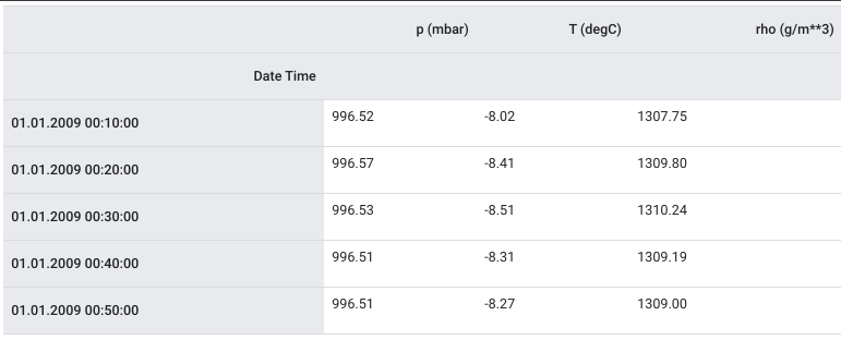 - Max Planck Institute for Biogeochemistry에 의해 기록 된 [날씨 시계열 데이터 세트]를 사용합니다