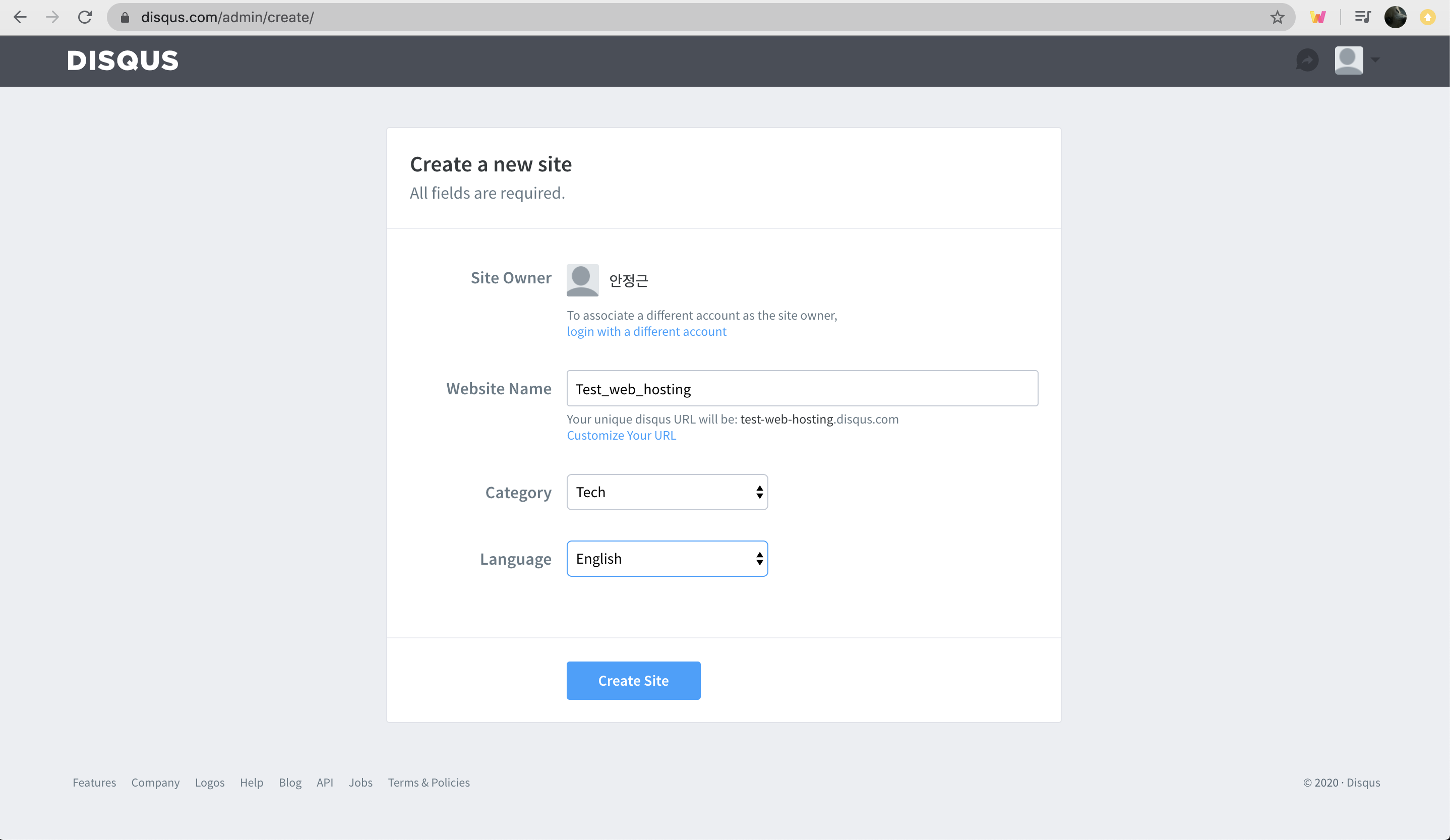 사이트의 이름, 카테고리, 언어를 적당히 입력해줍니다. 제가 이용하는 시점에는 한국어 설정이 없어 영어로 설정했습니다.