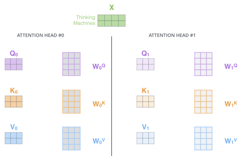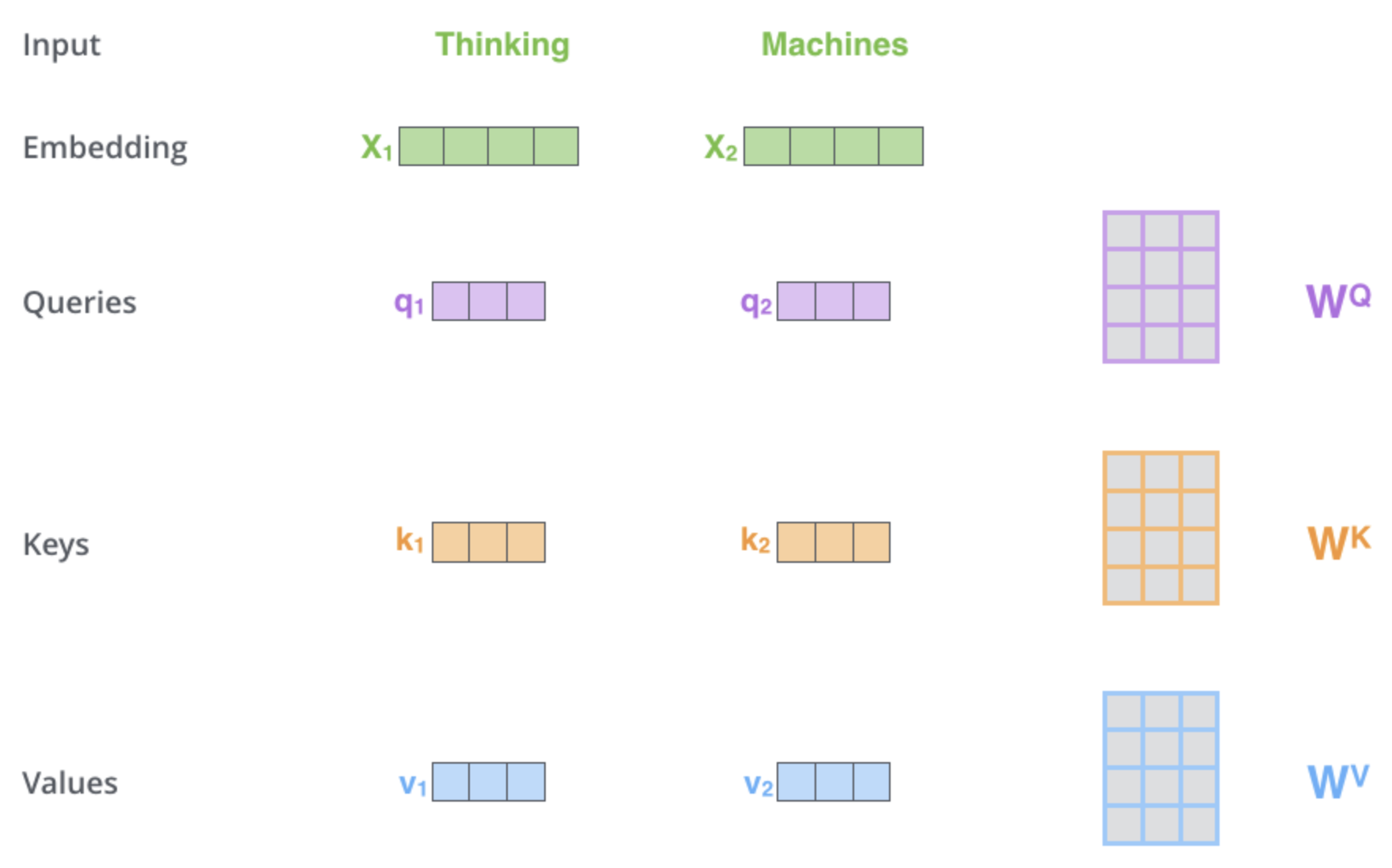 같은 방법으로 입력 문장에 있는 각 단어에 대한 query, key, value 벡터를 만들 수 있습니다.