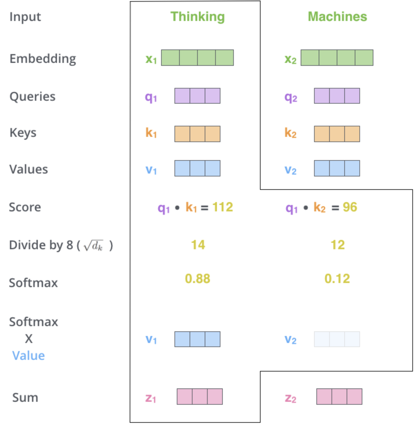 attention 이 어떻게 계산되는지를 알게 되면, 세 개의 벡터들이 어떤 역할을 하는지 알 수 있게 됩니다.