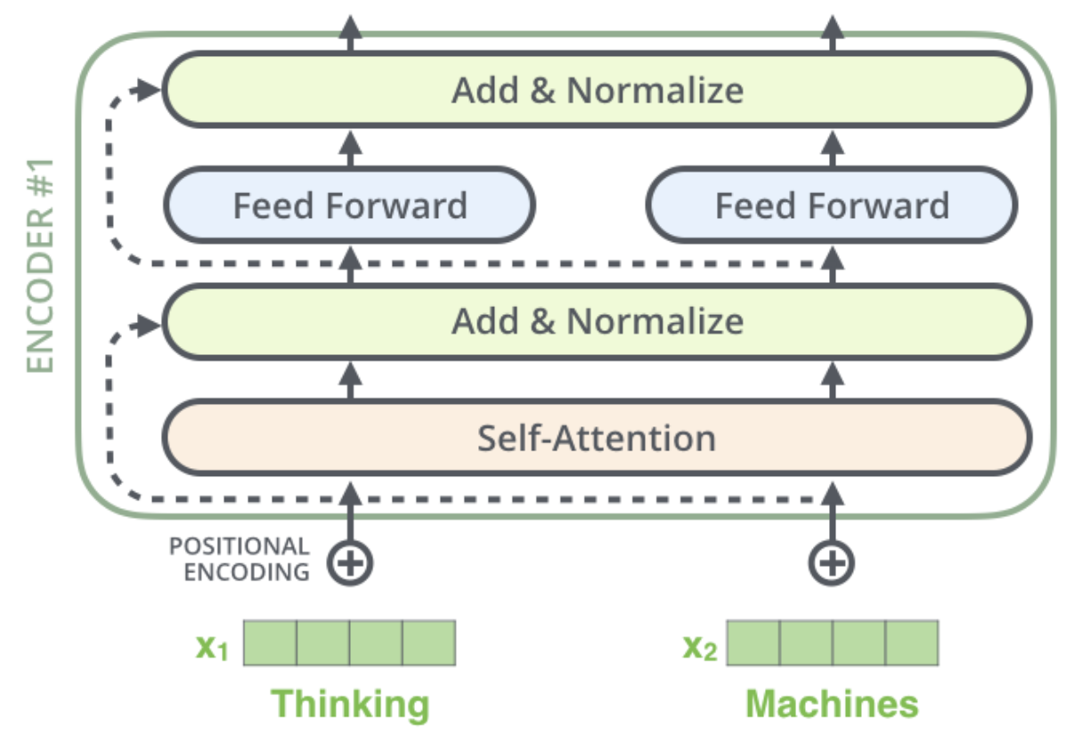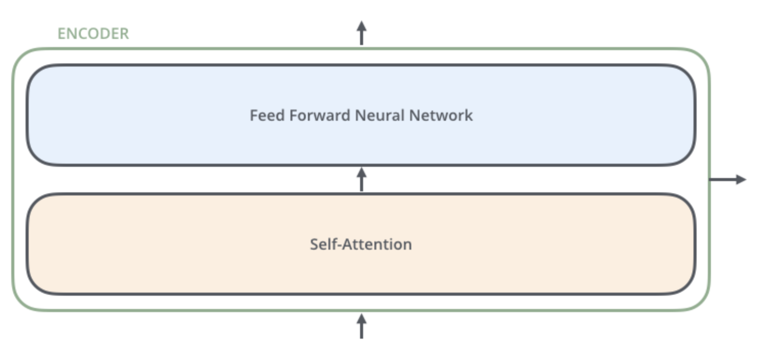 encoder는 입력으로 벡터들의 리스트를 받습니다. 이 리스트를 먼저 self-attention layer에, 그다음으로 feed-forward 신경망에 통과시키고 그 결과물을 그다음 encoder에게 전달합니다.