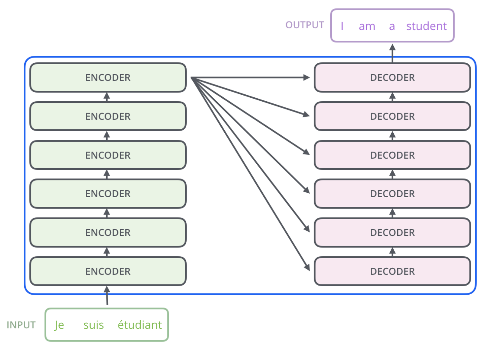 각 스텝마다의 출력된 단어는 다음 스텝의 가장 밑단의 decoder에 들어가고 encoder와 마찬가지로 여러 개의 decoder를 거쳐 올라갑니다.