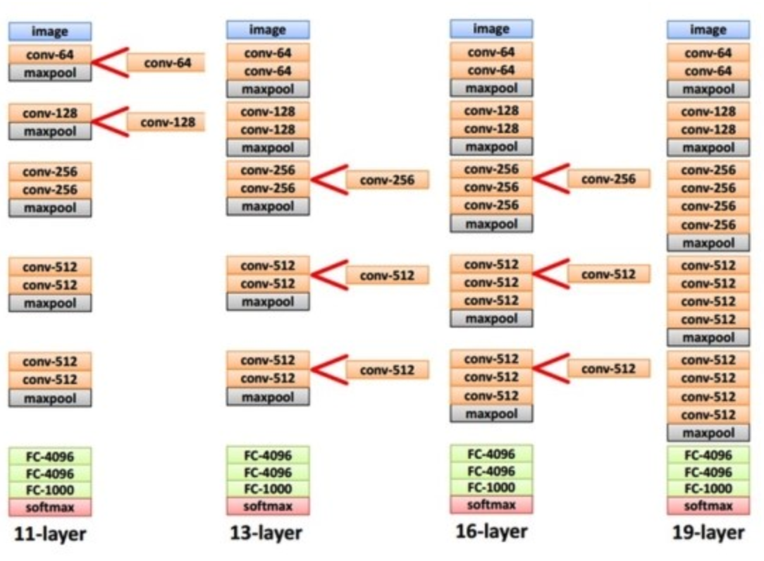 아래 그림은 VGGNet이 layer의 깊이를 어떻게 늘려가며 테스트했는지 보여줍니다.