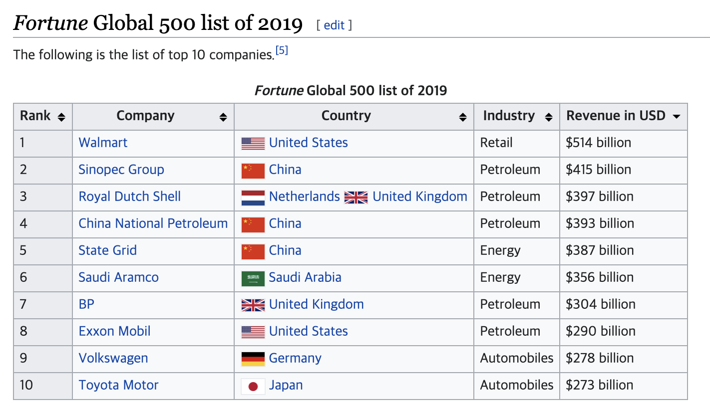 Fortune Global 500에 있는 테이블 정보를 가져와 보겠습니다.