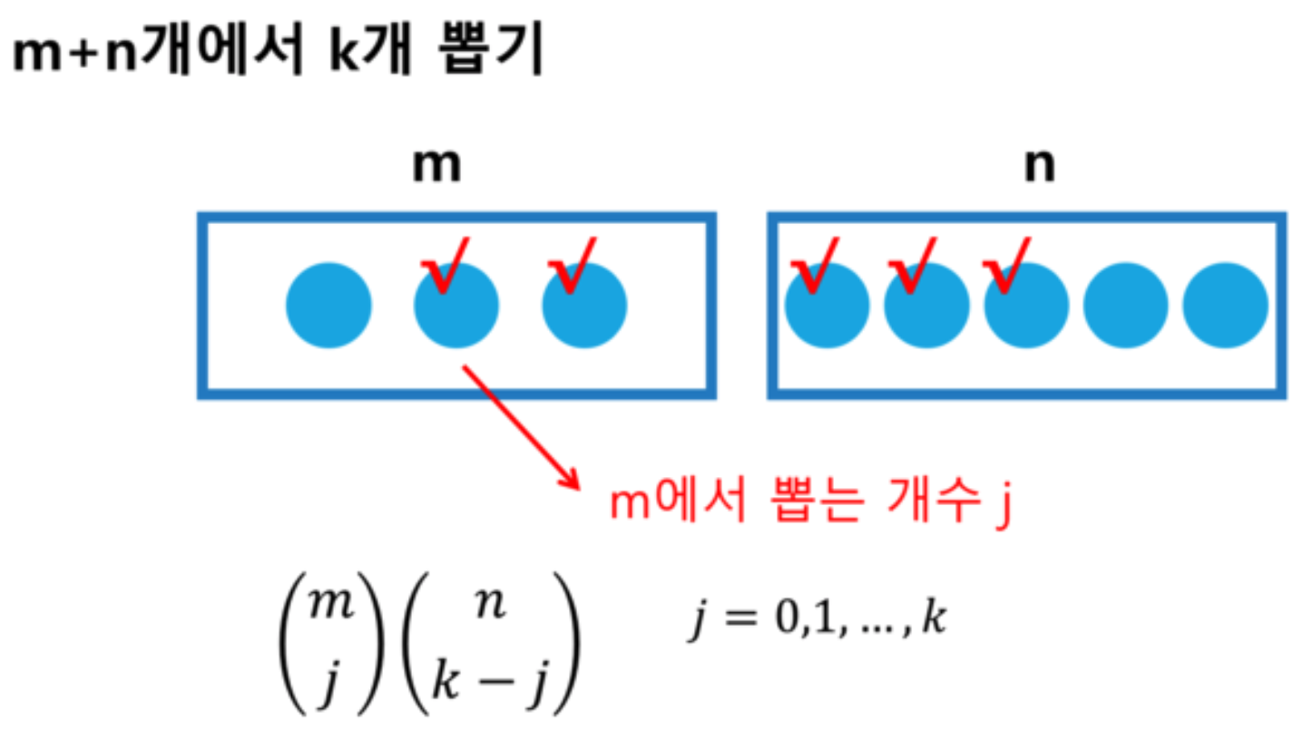 m+n개에서 k개를 뽑는것은 m개 원소가 있는 상자와 n개의 원소가 있는 상자에서 j개와 k-j개를 뽑는것으로 생각할 수 있다. 이 때 j는 0부터 k까지 가면서 모든 경우를 다 더하면 동일한 값을 구할 수 있다.